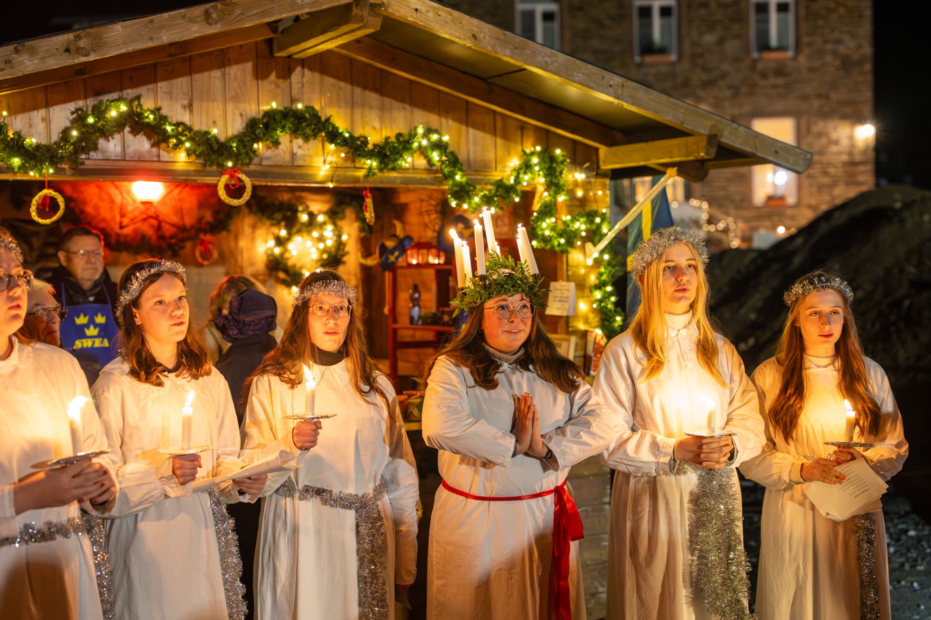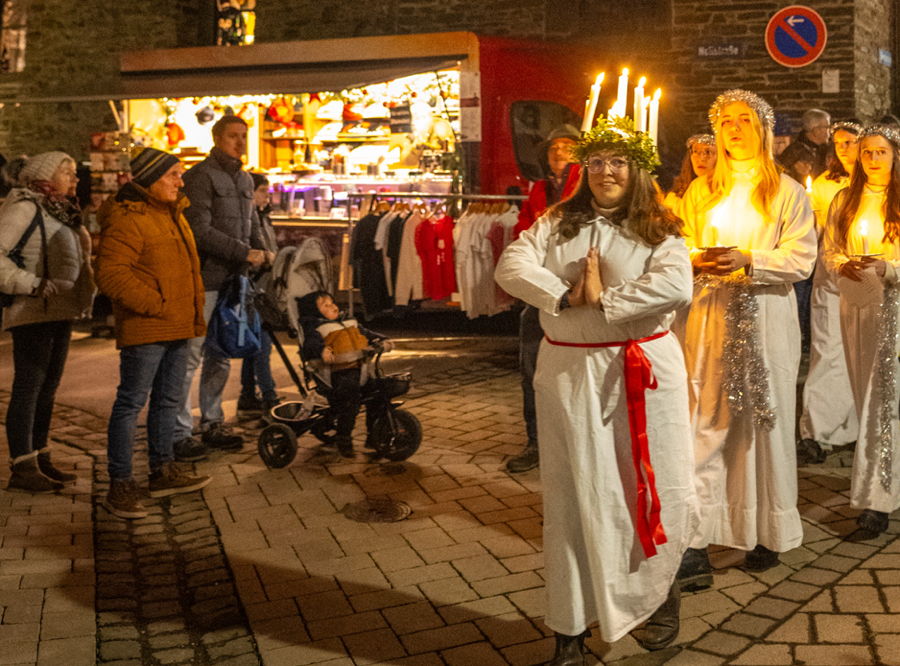 Neben den vielen Ständen lockt der Lucia-Markt mit einem abwechslungsreichen Programm, das Jung und Alt begeistert. Besonders der Rundgang der Lucia, bei der eine junge Frau mit einem Lichterkranz auf dem Kopf als Lucia durch das Dorf schreitet und von einem Gefolge begleitet wird, ist ein Höhepunkt der Feierlichkeiten. Dieser traditionelle Umzug sorgt für eine besinnliche Stimmung und bringt den eigentlichen Gedanken des Lucia-Festes zum Ausdruck. Begleitet wird die Heilige Lucia von schwedischen Chorgesängen, die durch die engen Gassen hallen und für eine festliche Atmosphäre sorgen.